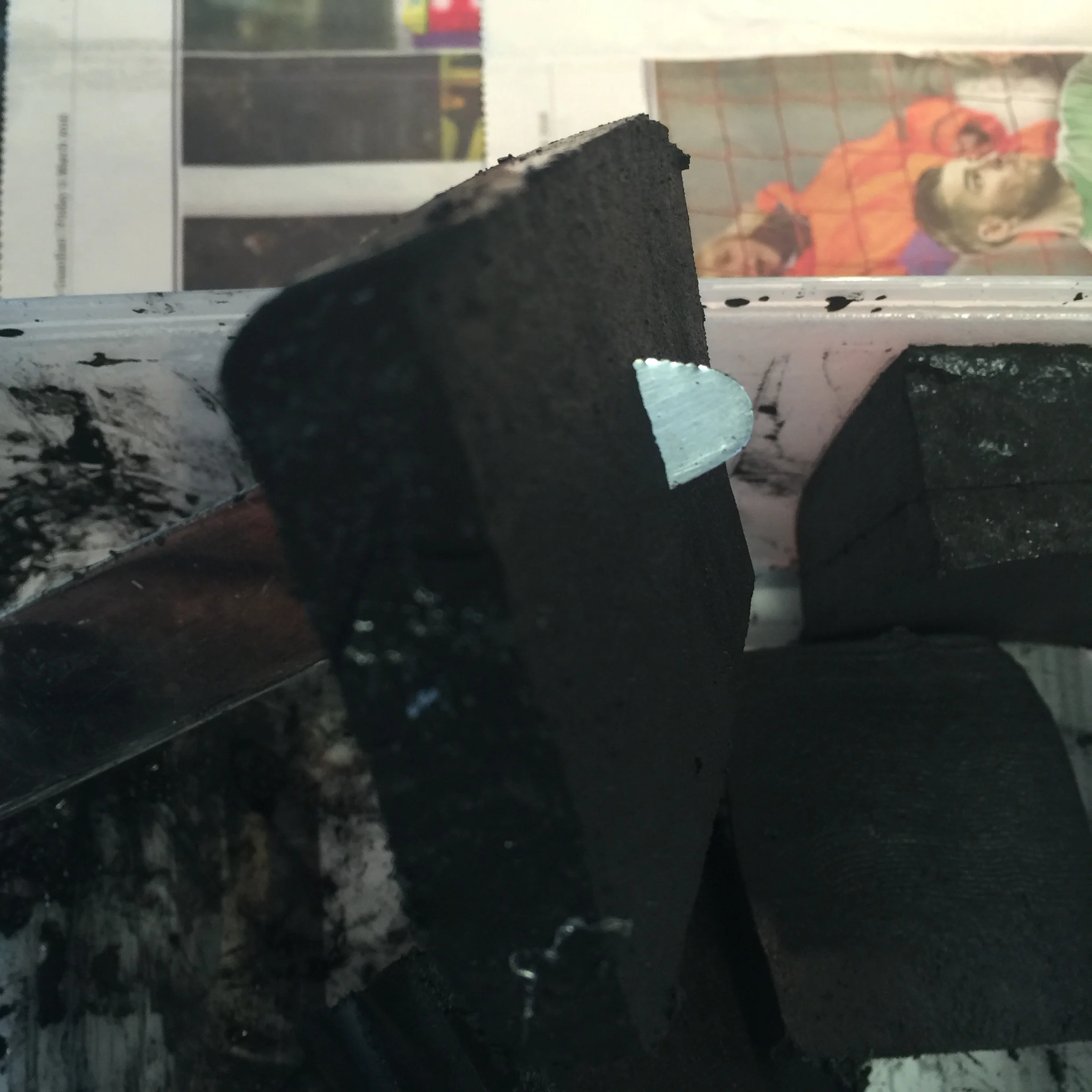 The final stages involve the grinding down, rubbing, and polishing of the surface by hand to its marble finish. The painting is rubbed with water & off-cut remnants of canvas; a process of erasure and mending to render the fissured surface stable. Some of the areas in the works are subsequently imbued with linseed and waxes. Especially fragile paintings are burned with encaustic to hold them together. The divisions and spatial outlay in the canvases are informed (sometimes subverted) by the formulae of the golden section; the regimented geometry marries defiantly against the organic free roaming nature of the fissures that appear tenuously embedded in the surface, sometimes spilling over the strict linear divisions - they refuse to be contained.
