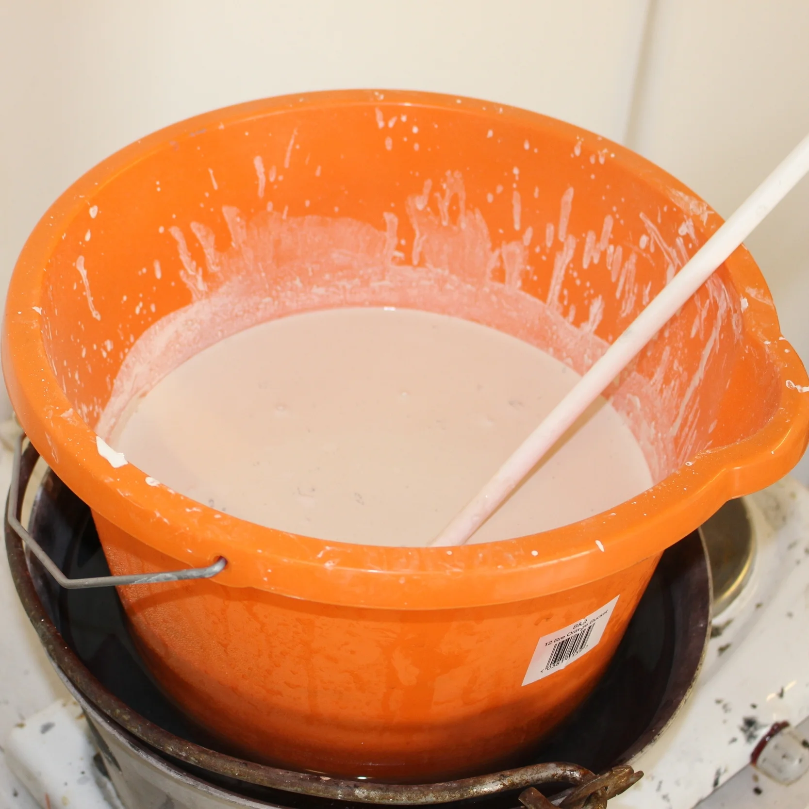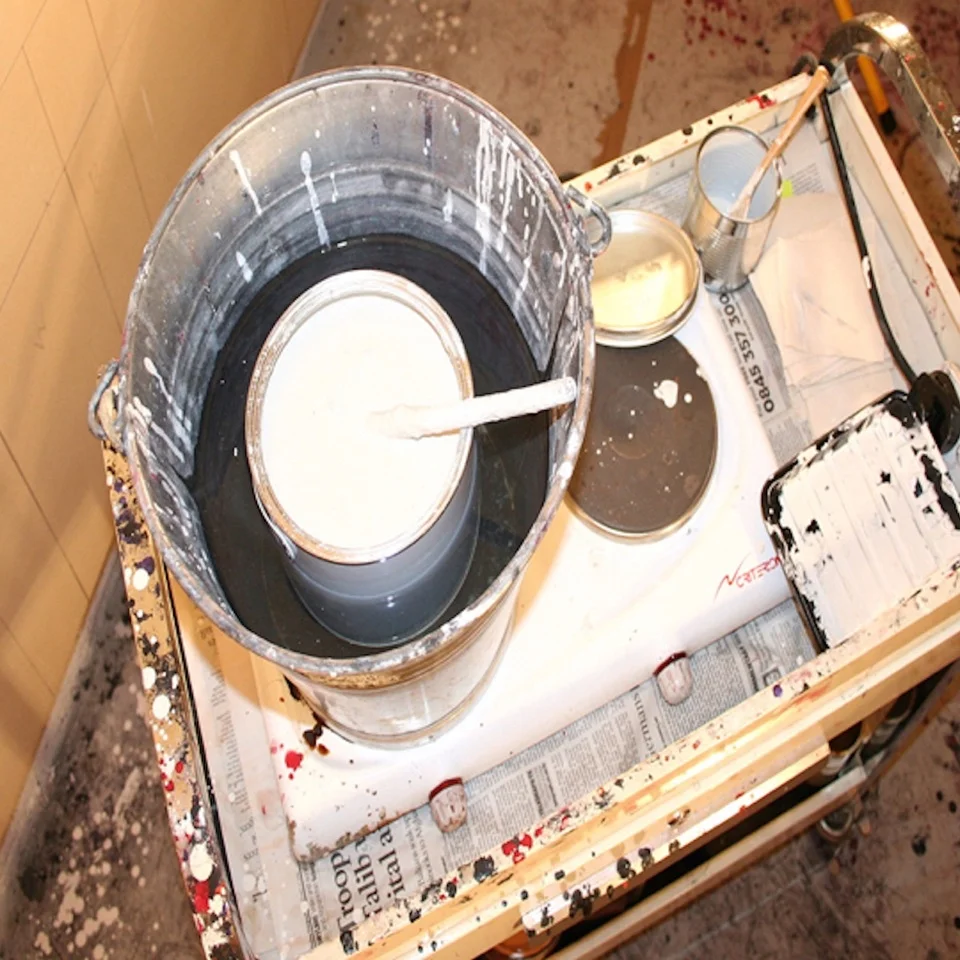 Traditionally, gesso is a formative ground on which to paint, produced by applying many layers of chalk or a natural earth pigment and a gelatine binder, to the canvas. Gunn makes the gesso using an ancient recipe used for centuries dating back to before the Renaissance. The material is natural and organic, not to be confused with acrylic gesso pre-made and bought in modern day art suppliers. Up to around twenty layers of the specialised paint are applied and as the gesso dries, each layer bonds with the last to form an exterior skin. Through manipulating the paint and environmental conditions, the materiality and vulnerability of the process is exaggerated.